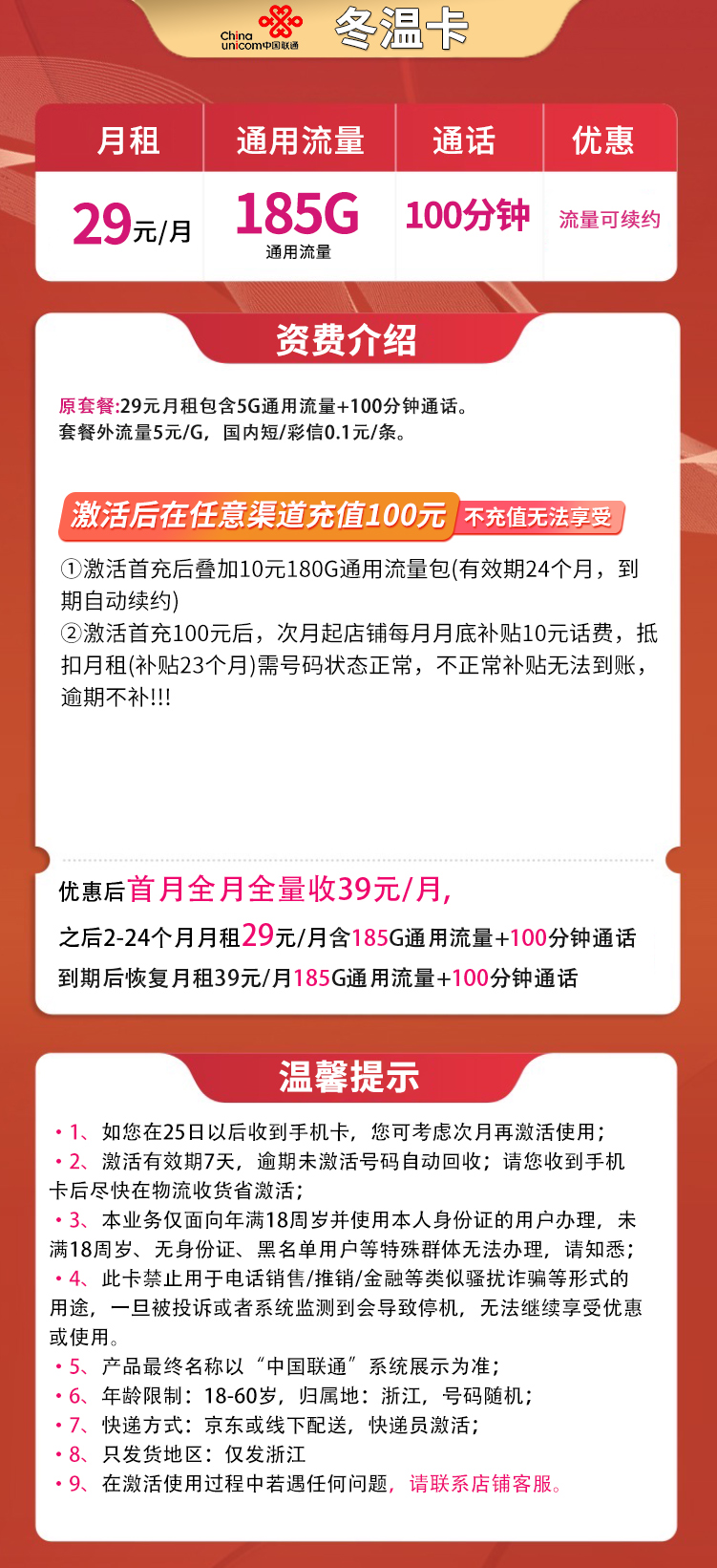 MF联通冬温卡29元185G通用+100分钟【只发浙江】