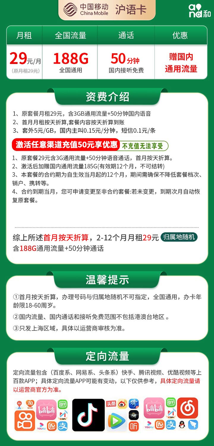 G1联通金龙卡29元219G通用流量+100分钟【只发广西】