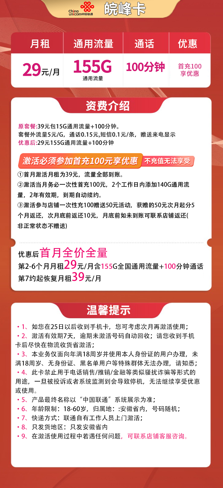 联通皖峰卡29元155G通用+100分钟【只发安徽】